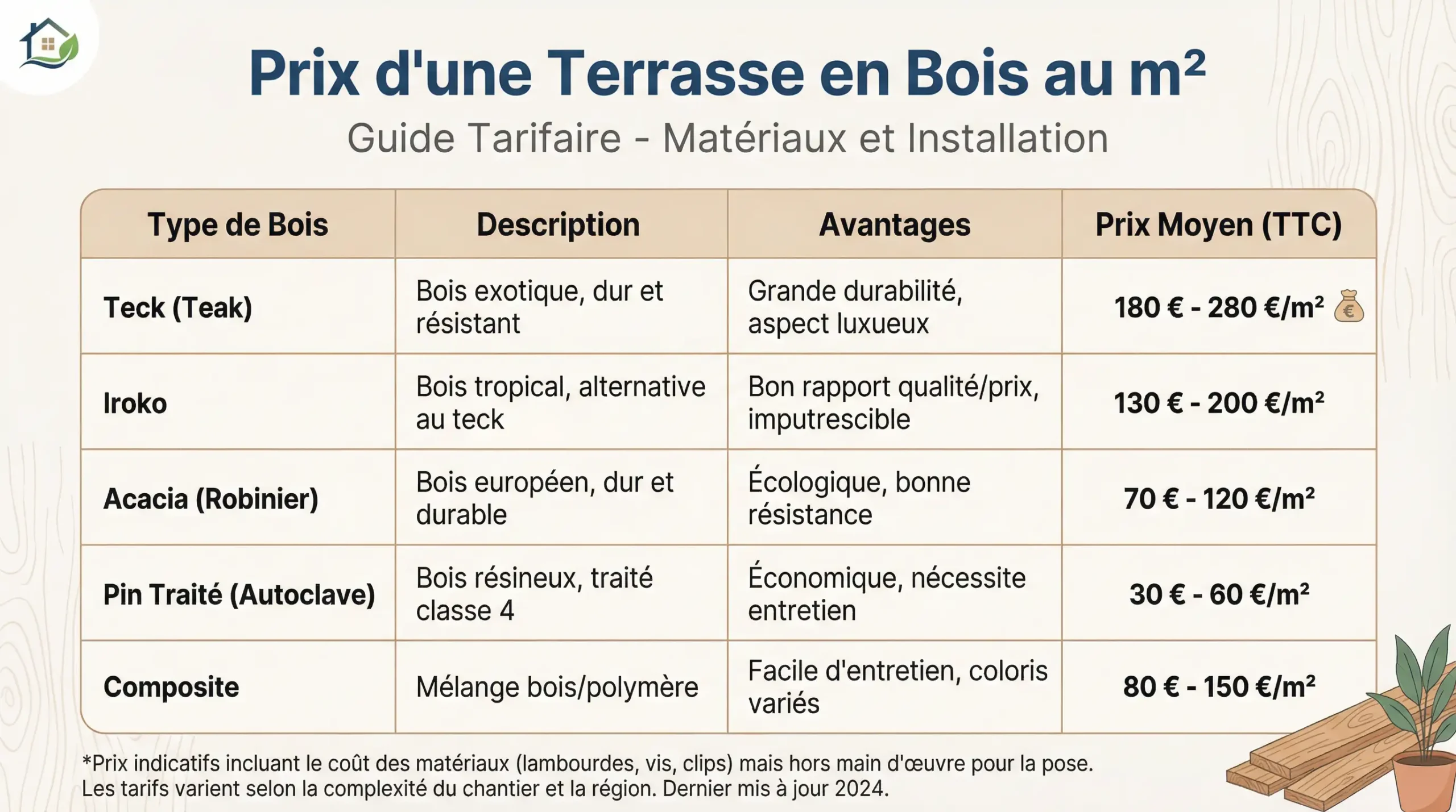 | Type de bois | Prix fourniture/m2 | Prix pose comprise/m2 | Durée de vie |